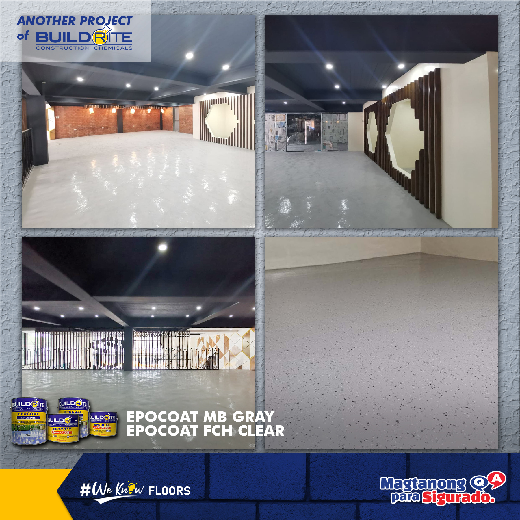 MJB Konstruct used EPOCOAT MB GRAY plus EPOCOAT FCH CLEAR for a function room in Dumaguete City. Aside from using the color of the primer plus the clear, glossy look of the floor coating, they also broadcasted flakes onto the floor coating to add a beautiful effect. As a loyal client of Buildrite, MJB Konstruct already have sufficient knowledge to create amazing designs like this one using a combination of Buildrite products.
