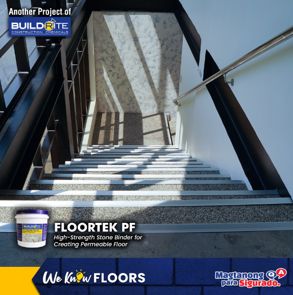 In this project, we used our stone carpet technology for the stairs of an office building in Bulacan. A stone carpet design was chosen because it perfectly matches the new stucco wall of the office. Aside from aesthetic benefits, this new flooring technology also provides excellent slip resistance, especially for stairs, pathways, patios, etc.