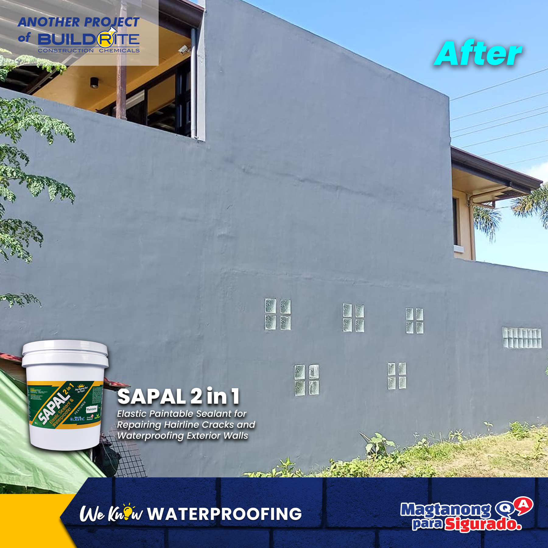In this project, a loyal client of Buildrite used SAPAL 2 IN 1 for a residential home in St. Jude Subdivision, Naga City. Contractor Bryan Roy Saguit’s Double D Fabrication and Supplies always use Sapal 2 in 1 for their firewall waterproofing projects because it never fails to satisfy their clients.