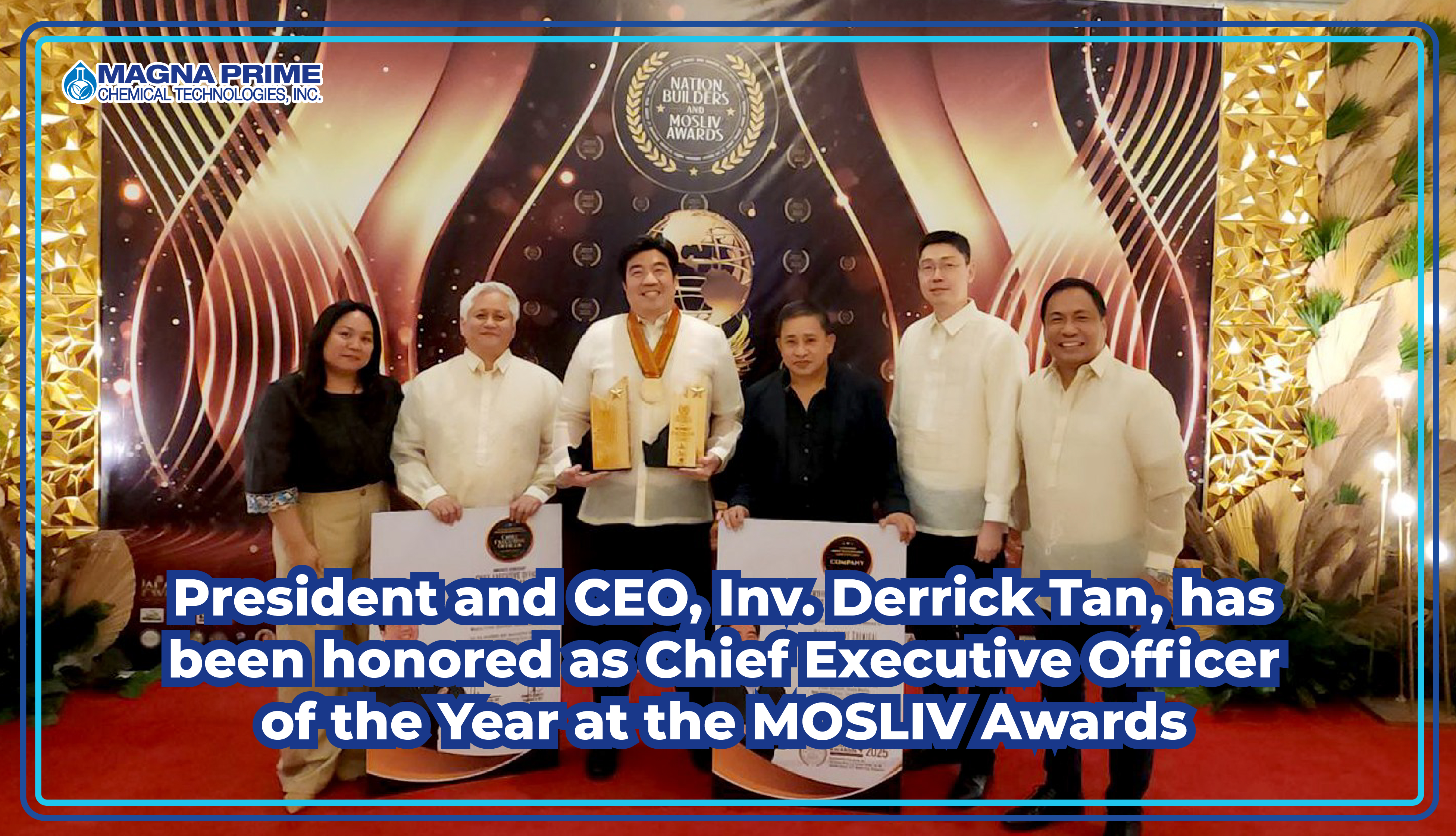 MANILA, Philippines – Magna Prime Chemical Technologies Inc. is proud to announce that its President and CEO, Inv. Derrick Tan, was honored with two prestigious accolades at the 8th Nation Builders & MOSLIV Awards, held on March 21, 2025, at the Grand Ballroom of Okada Manila.
